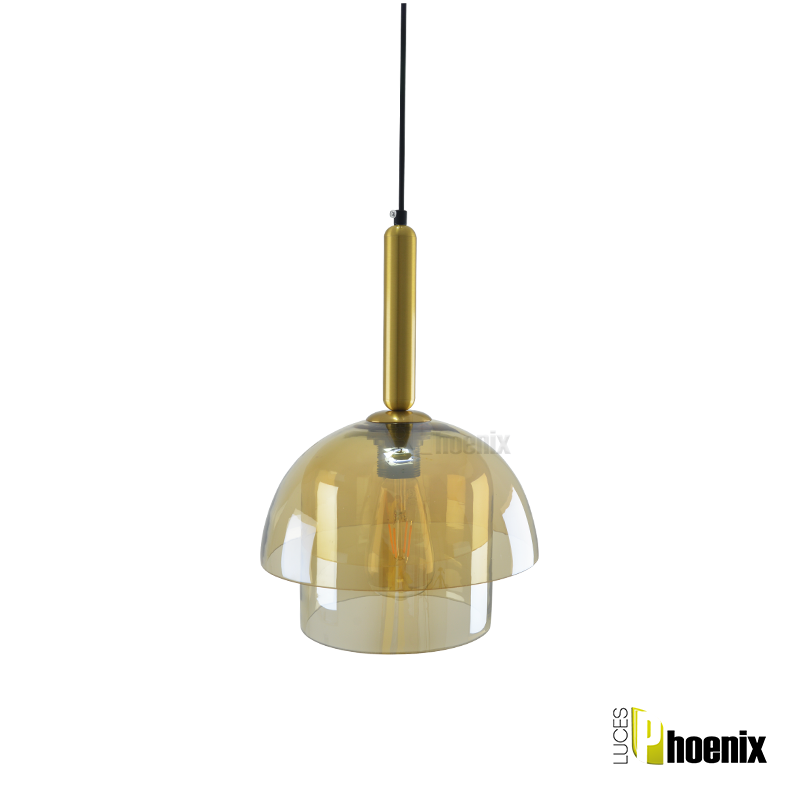 DAVACHI, es una lámpara colgante elaborada con vidrio acabado champaña y apliques en aluminio dorado envejecido, al igual que su tapa caja de 12 cm, cable Encauchetado negro 2×20 y socket E27.