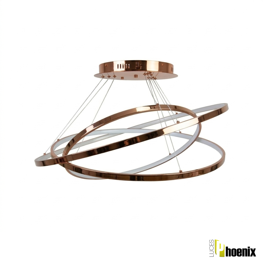 ONEL, es una lámpara colgante moderna y minimalista, sus tres aros suspendidos crean un efecto gravitacional, ideal para espacios modernos y limpios.